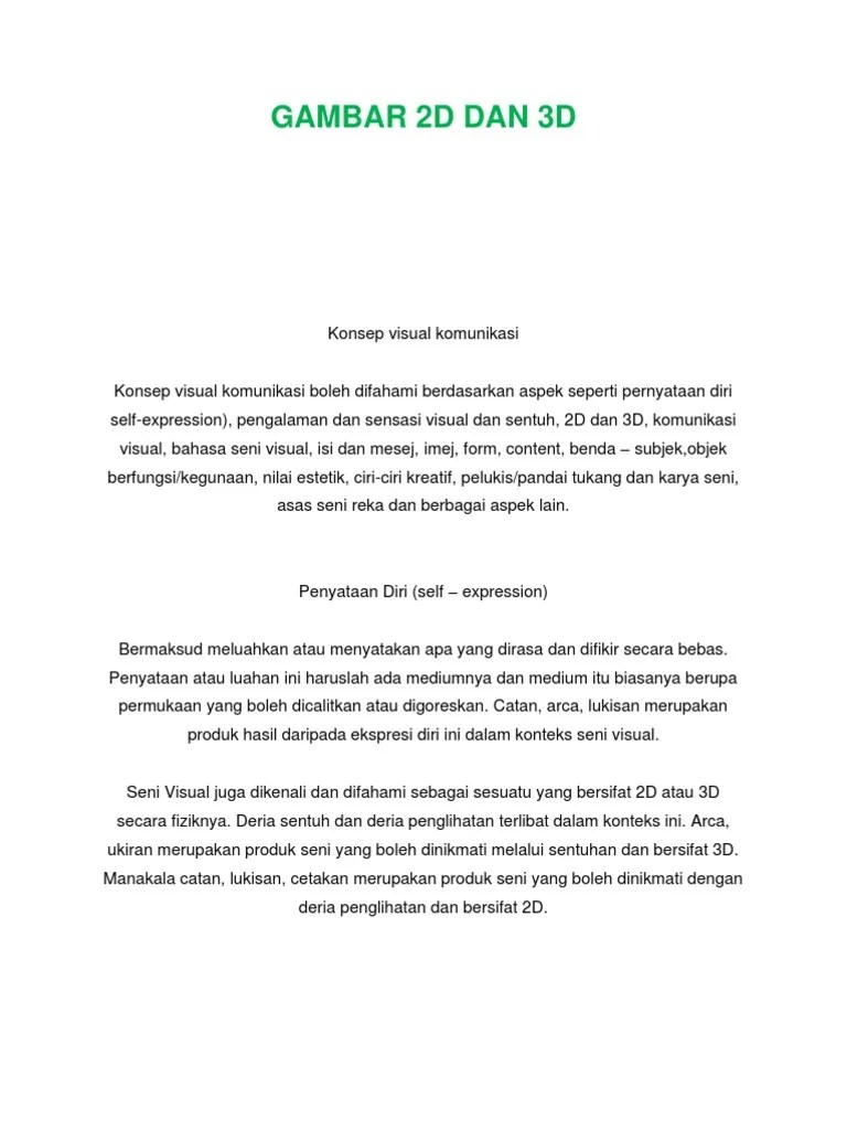 12/09/2021 · seni rupa 3 dimensi adalah karya seni rupa yang dibatas tidak saja dengan sisi panjang dan lebar, namun dibatasi oleh kedalaman atau tinggi.. Dirasmikan oleh tun mahathir 4. Contohnya adalah lukisan, gambar, batik, dan lain sebagainya. Menurut kamus dewan seni membawa maksud halus iaitu kecil, elok, tipis dan halus, enak di dengar iaitu mengenai suara, comel bentuk badan manakala. 05/09/2011 · nota seni visual stpm. Gambar 3 dimensi merupakan sebuah ilustrasi objek yang secara visual... Menurut kamus dewan seni membawa maksud halus iaitu kecil, elok, tipis dan halus, enak di dengar iaitu mengenai suara, comel bentuk badan manakala.